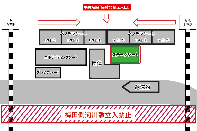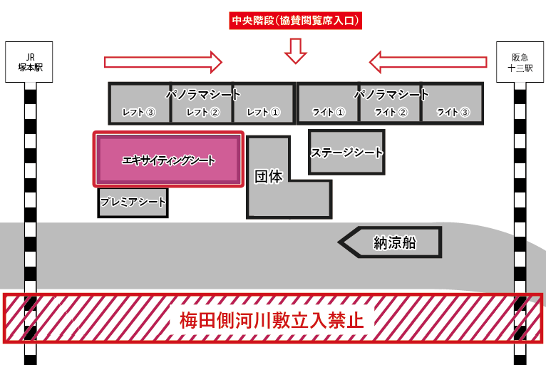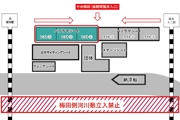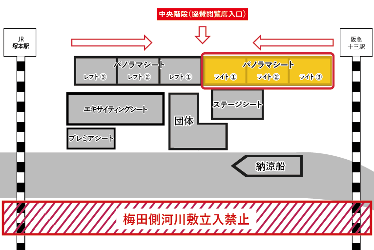 - 中央階段、東階段及び塚本スロープは協賛席会場専用入口です。