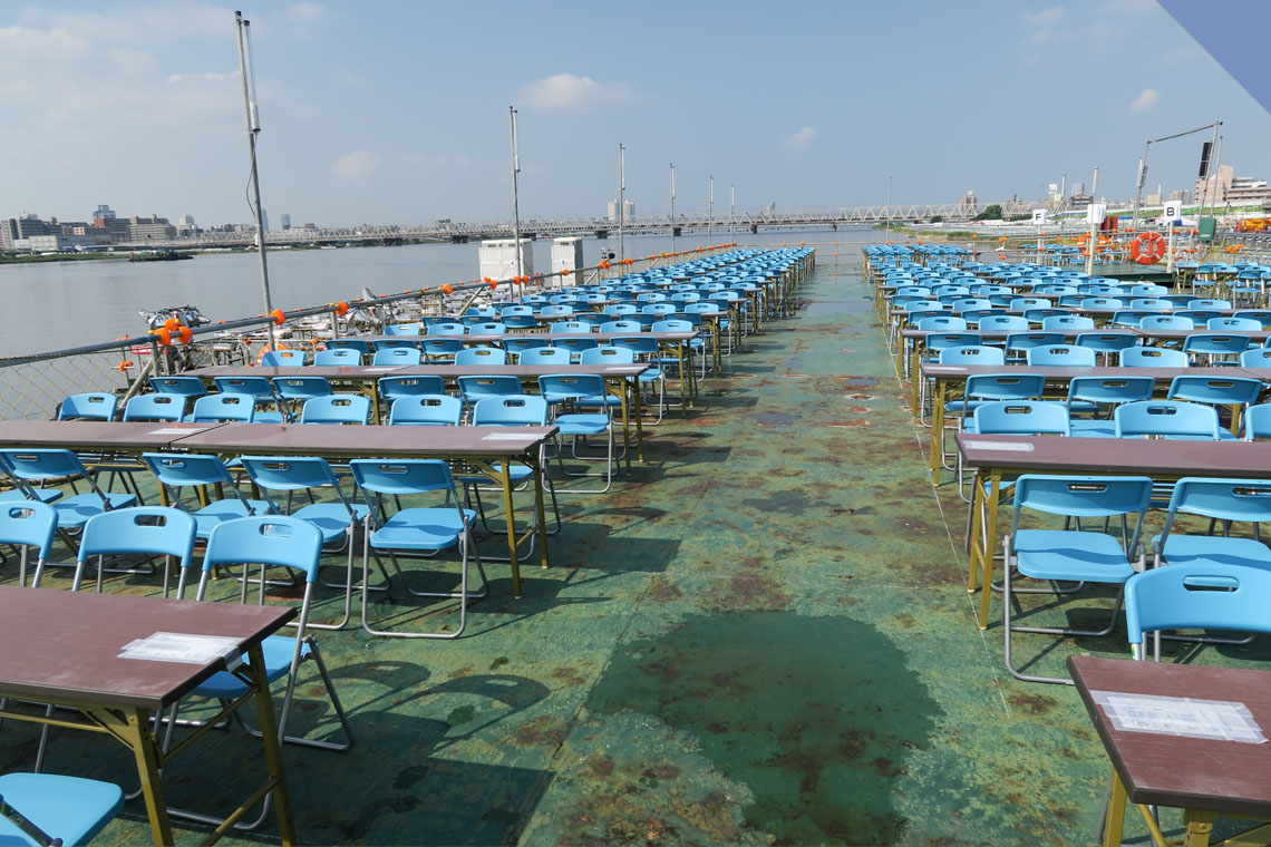知る人ぞ知る超特別席である納涼船。川岸から大型台船を着岸させた最も近くで花火を見ることができるシートです。